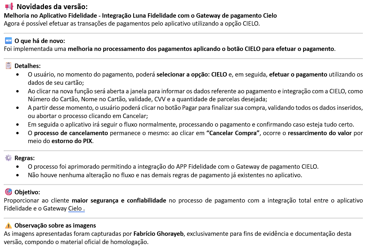 Melhoria no Aplicativo Fidelidade - Integração Luna Fidelidade com o Gateway de pagamento Cielo. |