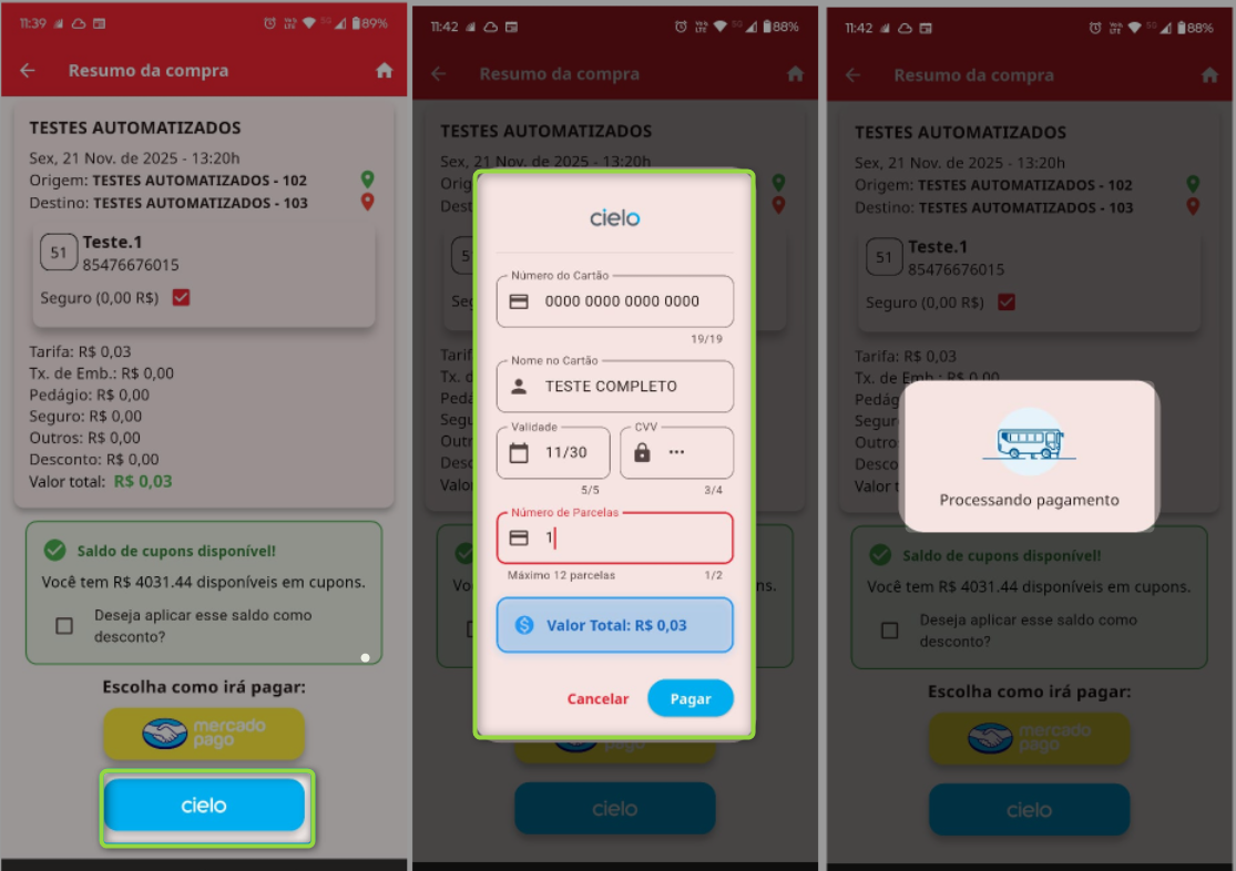 Figura 01, 02 e 03 – Imagens ilustrativas do processo de criação da integração Gateway CIELO para pagamento direto pelo Aplicativo. [Caminho]: Menu ➪ Escolha como irá pagar ➪ [Botão]: Cielo ➪ [Botão] Pagar: *Aplicativo FIDELIDADE. Nomes, documentos e telefones lançados nesse teste, são meramente fictícios. “Atendendo assim as normas da LGPD”. |