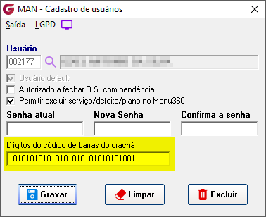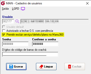 | Implementada opção "Permitir excluir serviço/defeito/plano no Manu360". Implementada opção para gravar código de barras do crachá do funcionário. Cadastros> Usuários Opção habilitar permissão para excluir serviço/defeito/plano