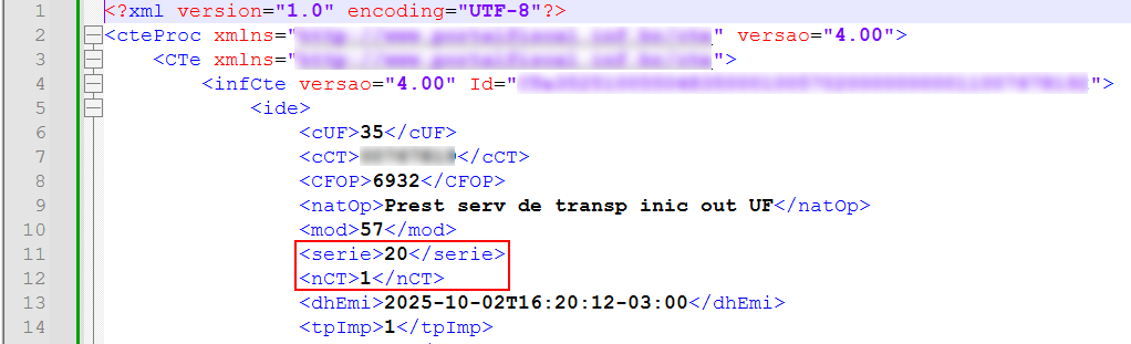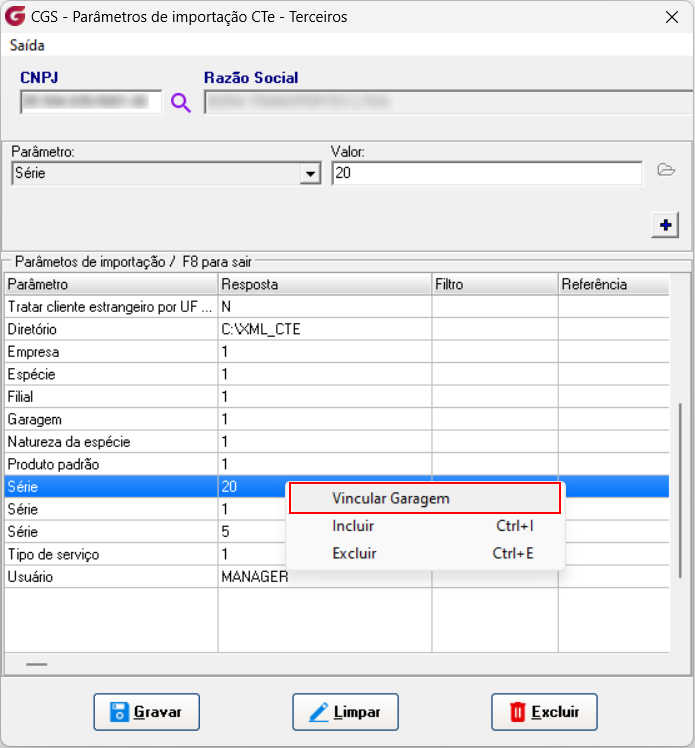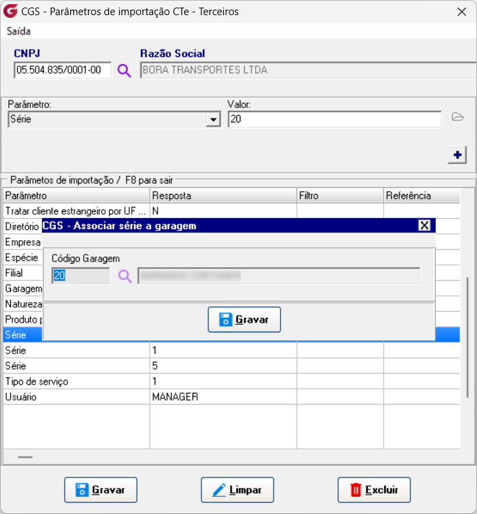 Nesse exemplo, parametrizamos a série 20 para ser importada na garagem 20