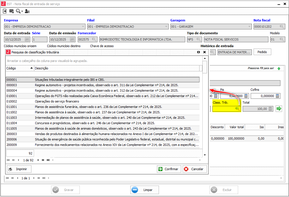 Implementado o campo "Class.Trib." com um botão de pesquisa ao lado para selecionar e informar a classificação tributária do serviço.