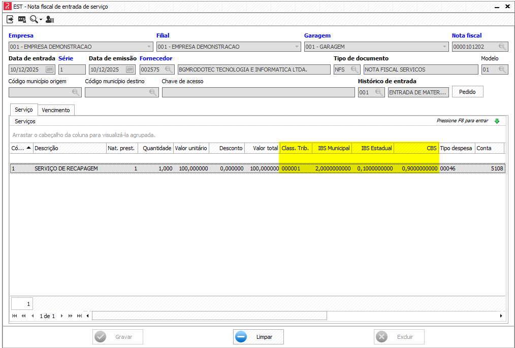 No grid de serviços foram implementadas as colunas: Class. Trib., IBS municipal, IBS estadual e CBS.