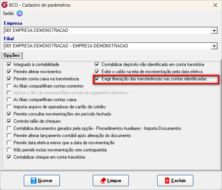 Foi adicionada opção para "Exigir liberação de transferências nas contas identificadas". Quando essa opção estiver marcada nos parâmetros da empresa e filial e também no cadastro da conta utilizada no processo, as transferências ficarão com status "Pendente" e precisarão ser liberadas, para que então sejam efetivadas na movimentação bancária.