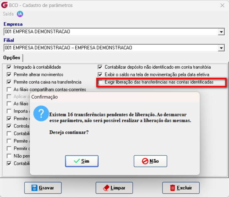 Obs.: Caso o usuário desmarque essa opção, após já ter gravado as transferências com status "Pendente", será exibida mensagem informativa indicando quantas transferências existem nessa modalidade e alertando que não poderão ser liberadas. A opção de exigência de liberação de transferências pode ser marcada ou desmarcada a qualquer momento, a critério do usuário.