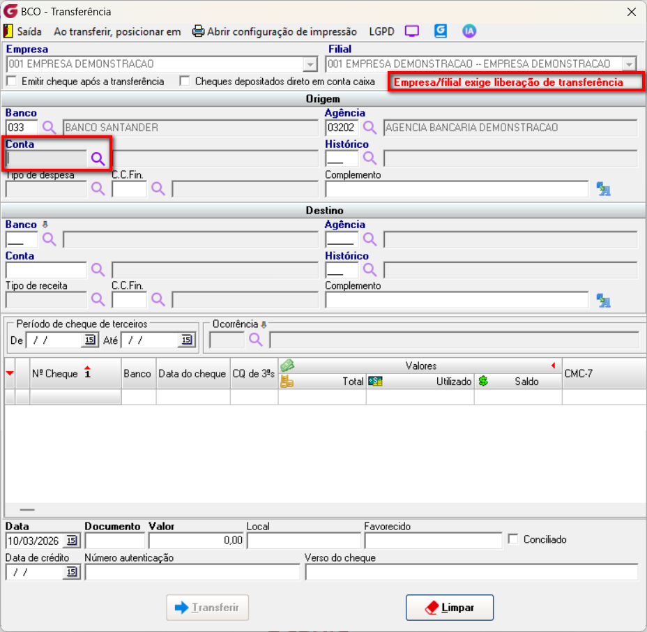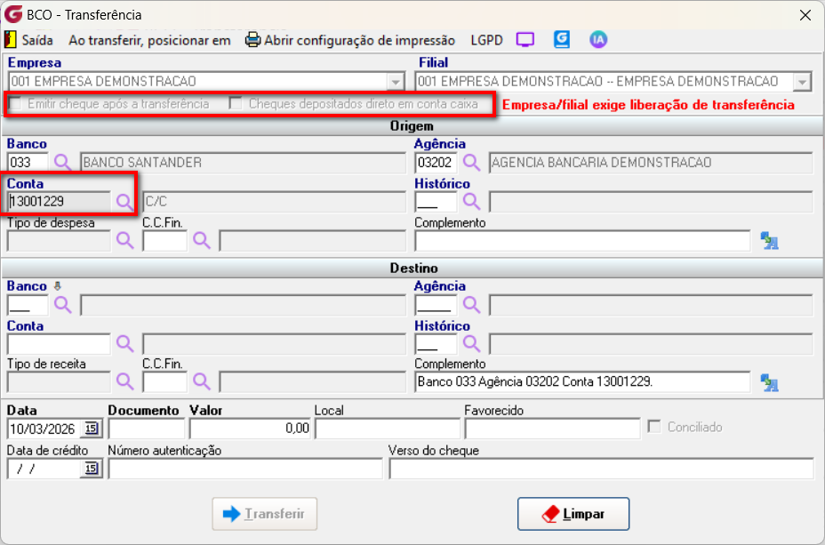 Obs.: Após passar pelo campo "Conta", a tela ficará enxuta, pois as informações relativas aos cheques não se aplicam ao processo. As opções de emitir cheque após transferência e cheques depositados direto em conta caixa ficarão indisponíveis para seleção.