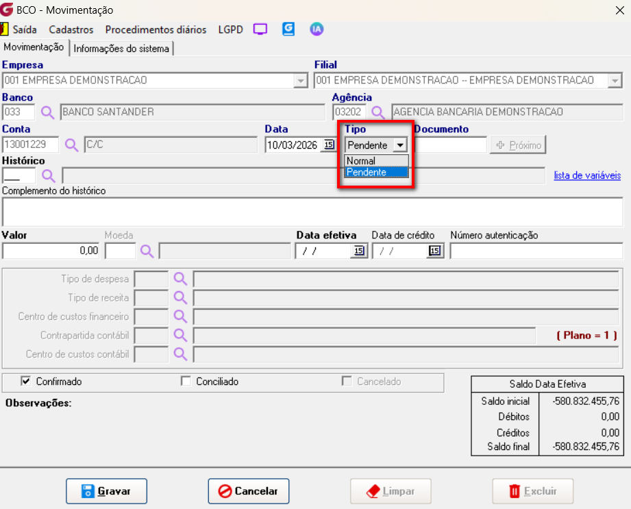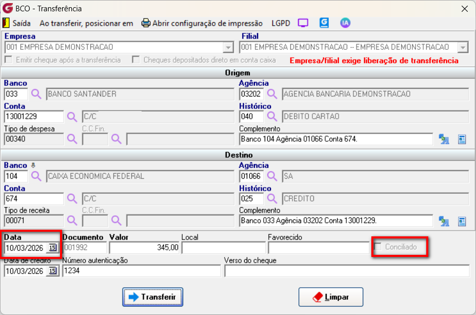 Transferências gravadas com o status "Pendente" não poderão ser conciliadas, somente após sua liberação, devido a isso, a opção "Conciliado" também ficará indisponível.