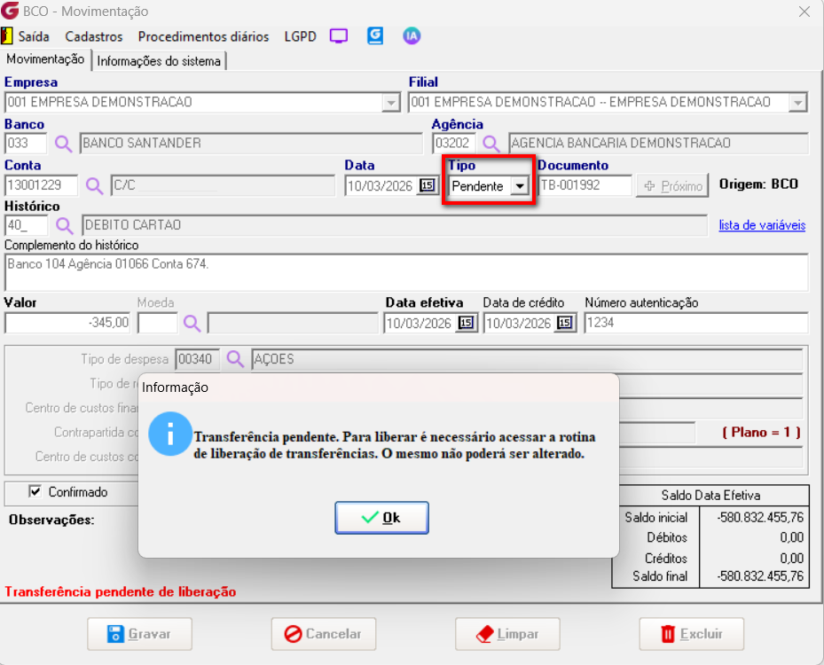 Ao consultar a transferência pendente será apresentada a mensagem indicando que para liberá-la será necessário acessar a rotina de liberação de transferências e que o movimento não poderá ser alterado.