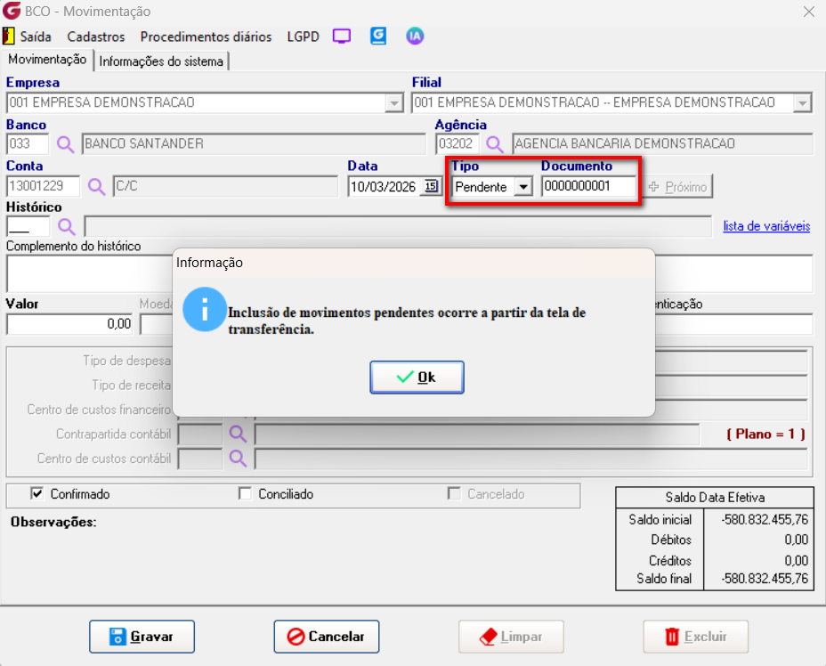 Transferências com status "Pendente" não constarão nos extratos bancários ou posição de saldos e não serão integradas para a Contabilidade.