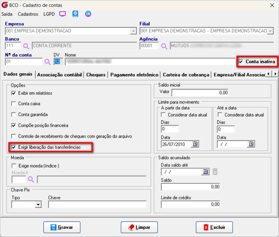 Contas inativas não serão exibidas no browser de pesquisa da tela de Liberação de Transferências, como também transferências que foram gravadas em contas que atualmente se encontram inativas não poderão ser liberadas, ao tentar liberar o sistema apresentará mensagem.