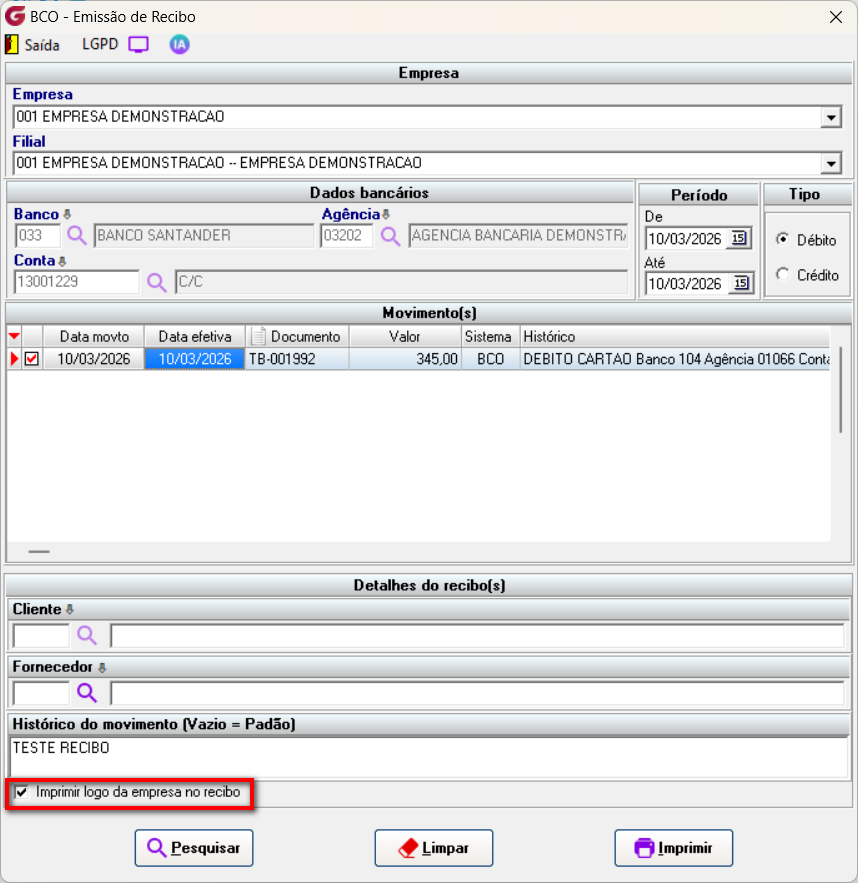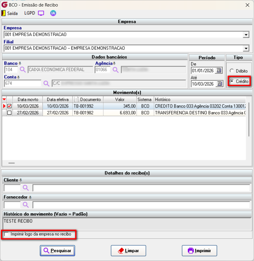 Obs.: Tanto movimentos de débito quanto de crédito exibirão dados bancários no recibo.