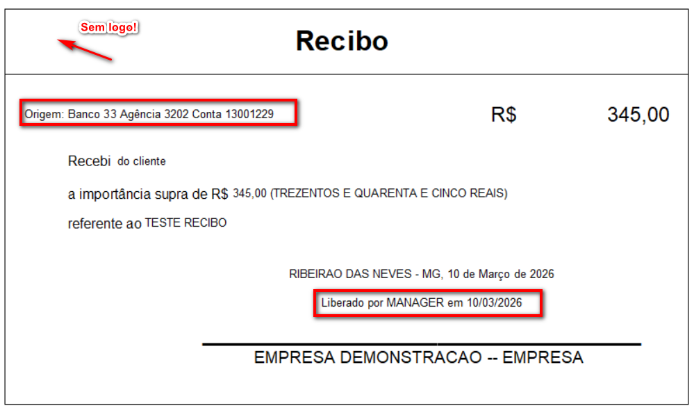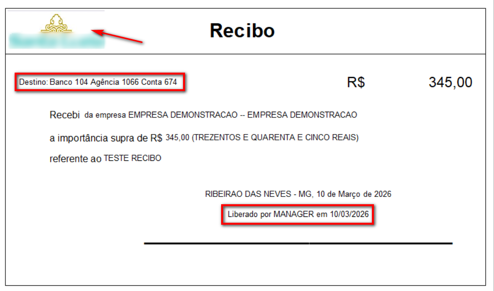 O recibo será impresso com logo da empresa e filial e também com o usuário que liberou a transferência e a respectiva data de liberação.