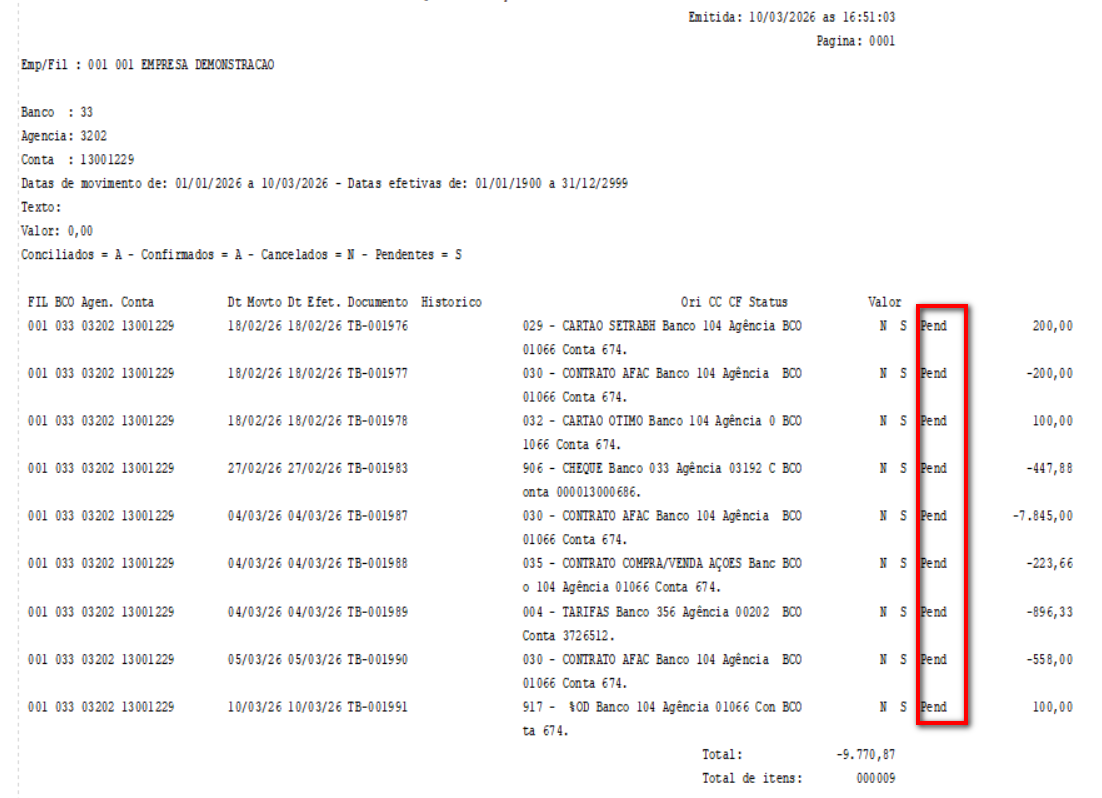 O relatório mostrará o status das transferências pendentes (Canc - Canceladas / Norm - Normal e Pen - Pendente) e mostrará usuário, data/hora de exclusão, se houver.