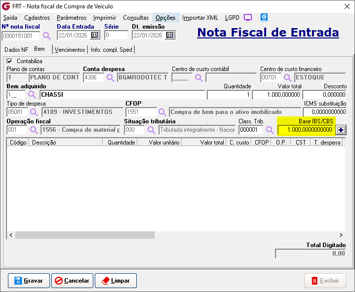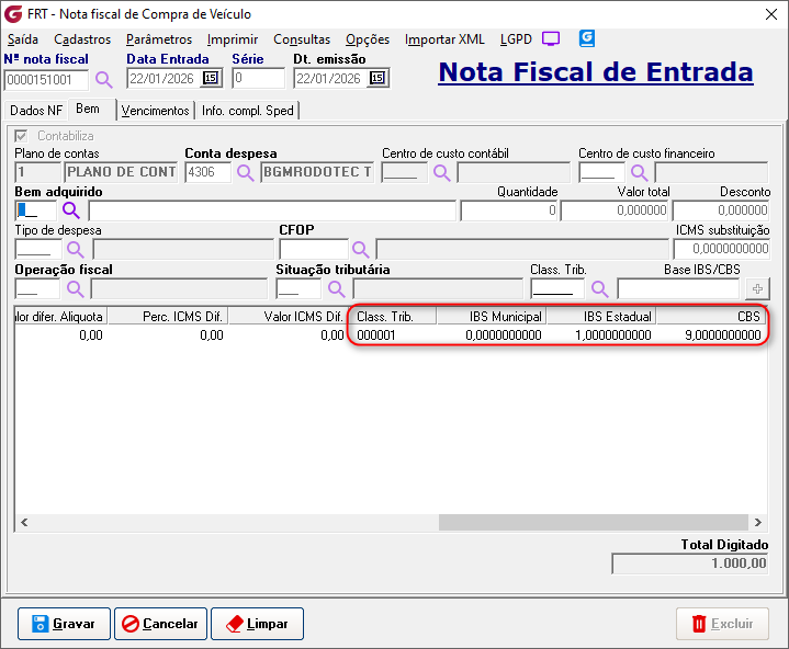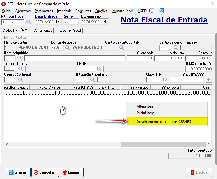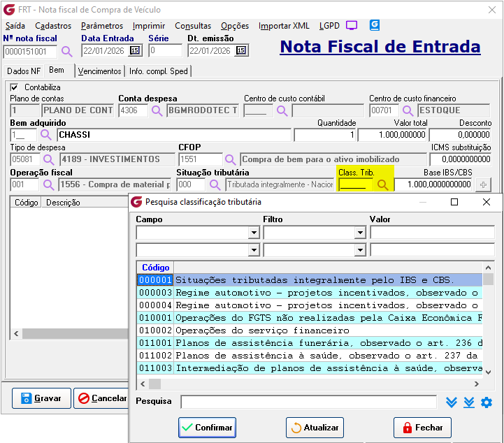Movimentação> Compra de veículos> Nota fiscal Implementado o campo "Class.Trib." com um botão de pesquisa ao lado para selecionar e informar a classificação tributária do item. ![]() Implementado o campo "Base IBS/CBS", que pode ser alterado de acordo com a necessidade. ![]() No grid de itens foram implementadas as colunas: Class. Trib., IBS municipal, IBS estadual e CBS. ![]() Selecionando a opção "Detalhamento de tributos CBS/IBS". ![]() É aberta tela com os detalhes dos tributos ![]() Movimentação> Venda de veículos> Nota fiscal Implementado o campo "Class.Trib." com um botão de pesquisa ao lado para selecionar e informar a classificação tributária do item.