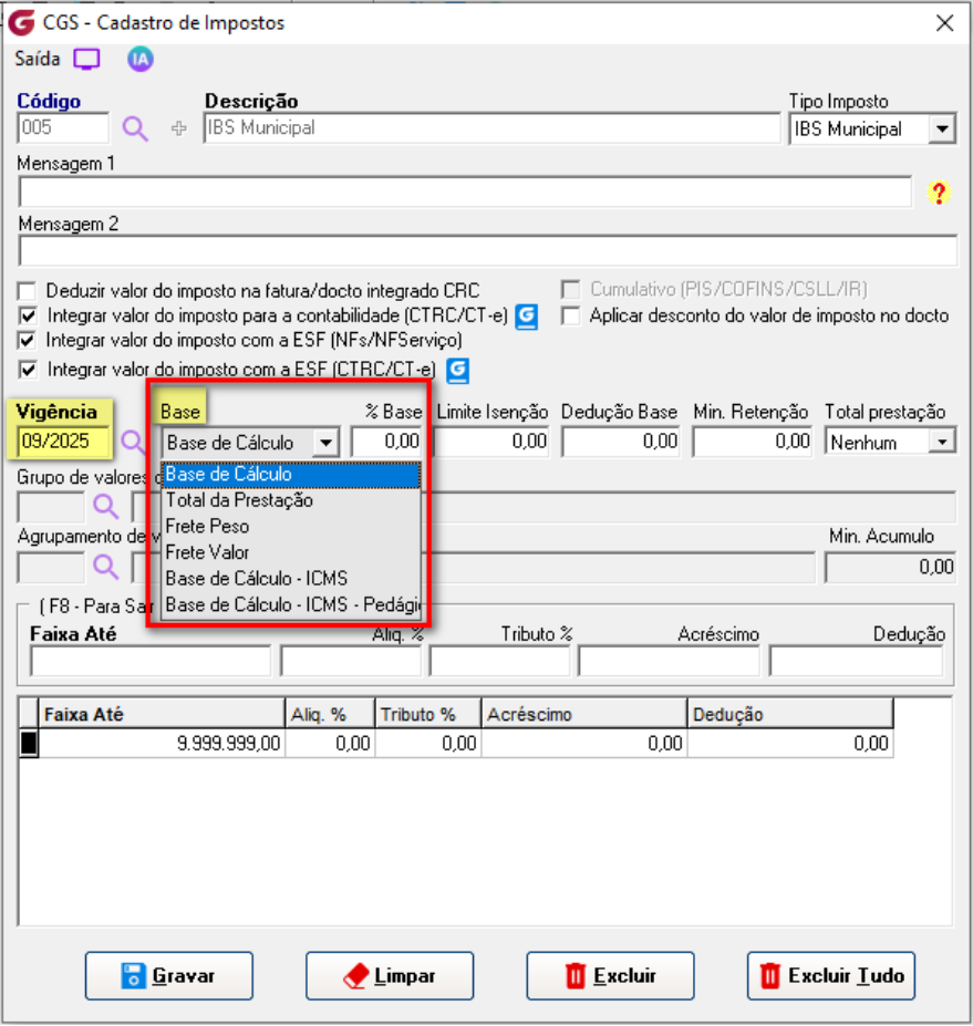 Em seguida, insira uma Vigência(Mês/Ano) no respectivo campo e selecione a formatação da Base, a qual será validada no cálculo deste imposto e informe uma faixa de valor no respectivo campo.