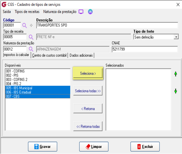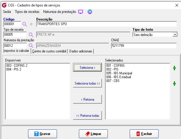 Os impostos cadastrados serão visualizados e podem ser associados ao tipo de serviço desejado, basta selecioná-los e efetivar o cadastro.