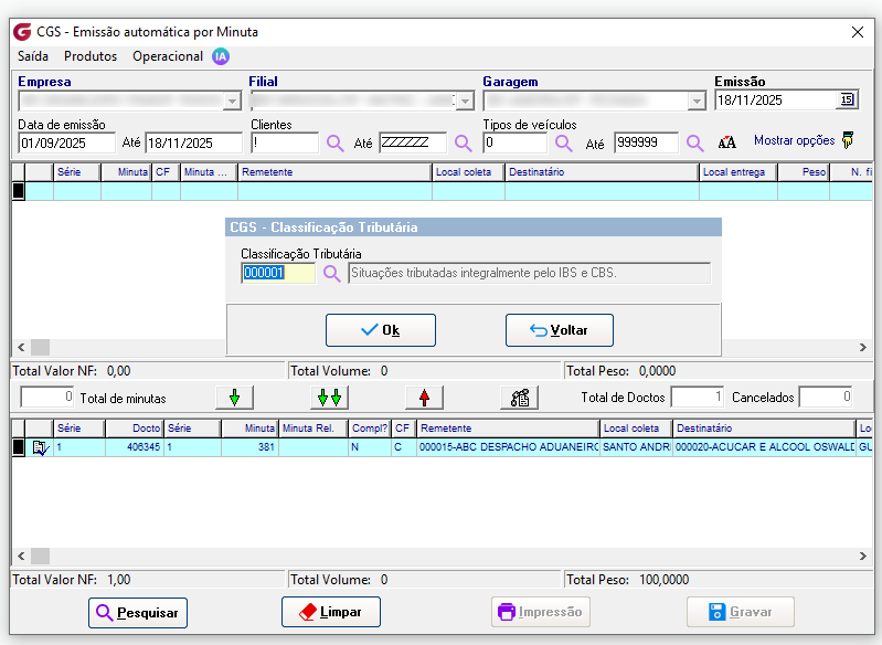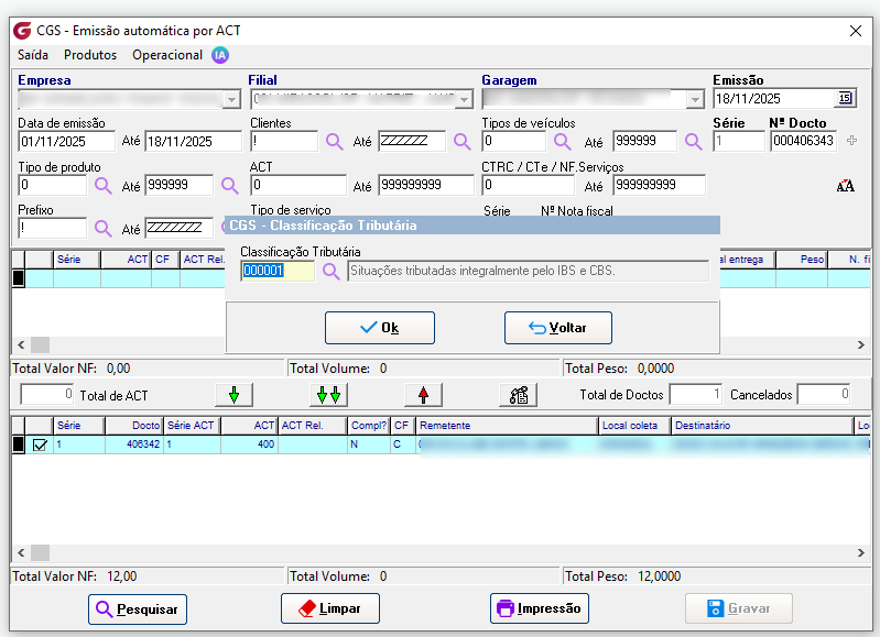 Este mesmo procedimento é replicado para as demais telas de emissão, como Emissão Automática por NF, Emissão Automática por Minuta, Emissão Automática por ACT. A diferença é que nessas telas a inclusão manual do CodClassTrib fica disponível sobre o botão direito do registro agrupado: