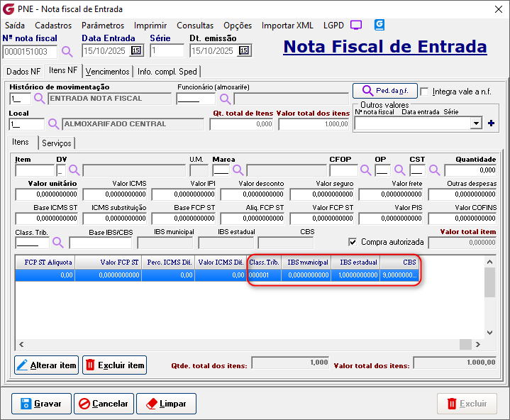 Implementados os campos "Base IBS/CBS", que pode ser alterado de acordo com a necessidade, "IBS municipal", "IBS estadual" e "CBS". que são gravados com os valores calculados de acordo com a base e a classtrib informada.