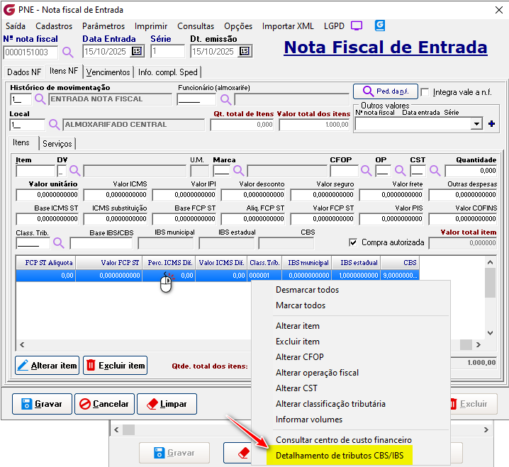 Selecionando a opção "Detalhamento de tributos CBS/IBS".