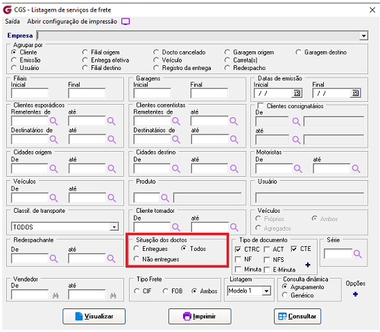 Todos: exibe todos os documentos, incluindo os que já foram baixados e os que ainda não tiveram baixa de entrega.