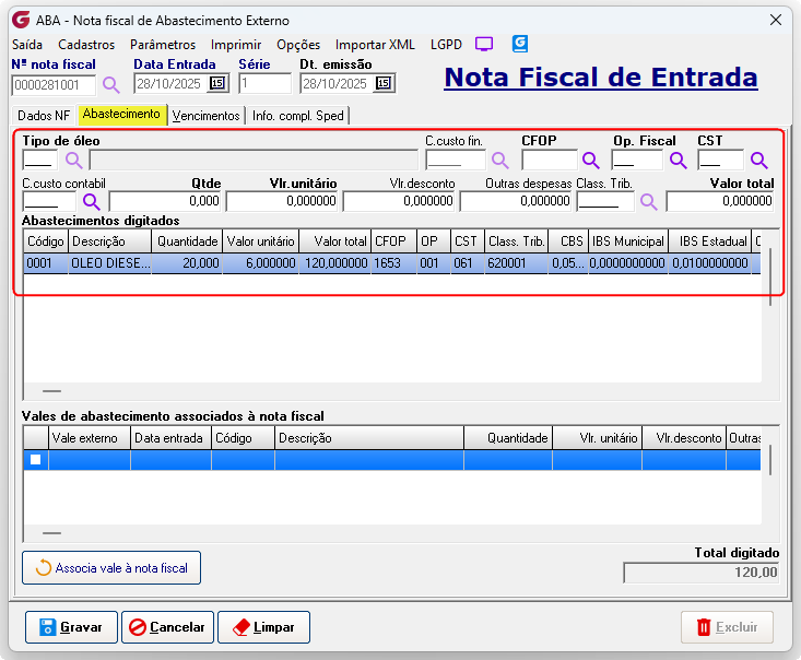 Gravar nota fiscal de abastecimento externo. |