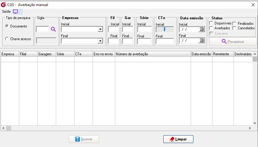 Permitir ao usuário realizar a averbação manual de CT-e quando o envio automático não foi concluído com sucesso ou quando for necessário informar o número de averbação diretamente no sistema. |