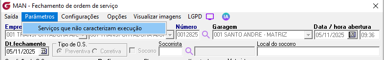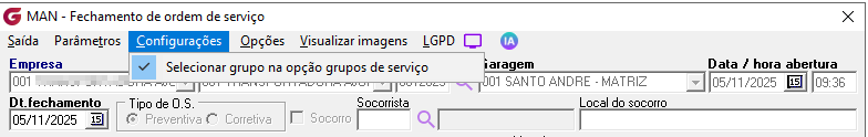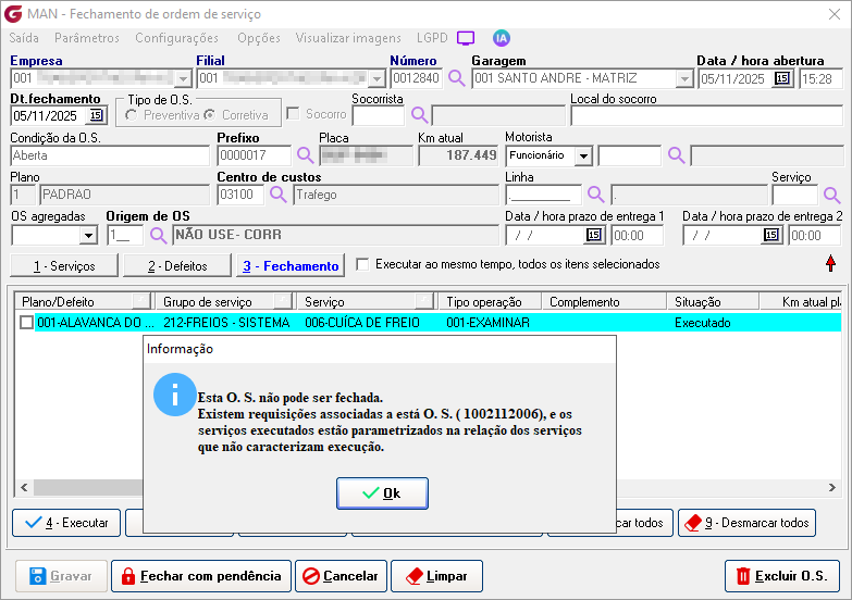 Se houver requisição de materiais associada à O.S e o serviço executado estiver parametrizado na relação dos serviços que não caracterizam execução, a O.S.não será fechada. Para efetivar o fechamento é preciso incluir algum serviço que não esteja parametrizado como não carcateriza execução. Configurações> Selecionar grupo na opção grupos de serviço