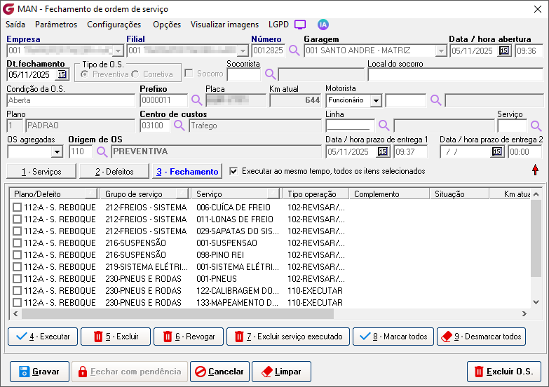 Fechamento de ordens de serviço corretivas e preventivas. |