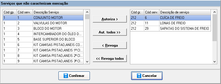 Ao selecionar o parâmetro é aberta tela para definir os serviços.