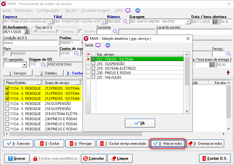 Com a configuração marcada ao utilizar o botão "Marcar todos" é aberta tela para selecionar de maneira aleatória quais grupos de serviços devem ser marcados.