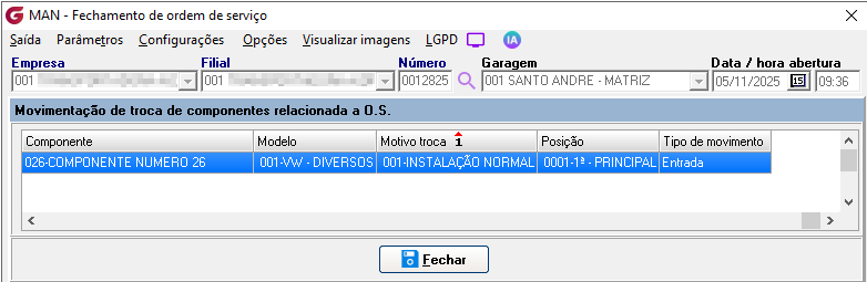 Opções> Visualizar movimentações de troca de componentes Com a opção marcada, se houver troca de componente associada à O.S. é aberta tela para consulta