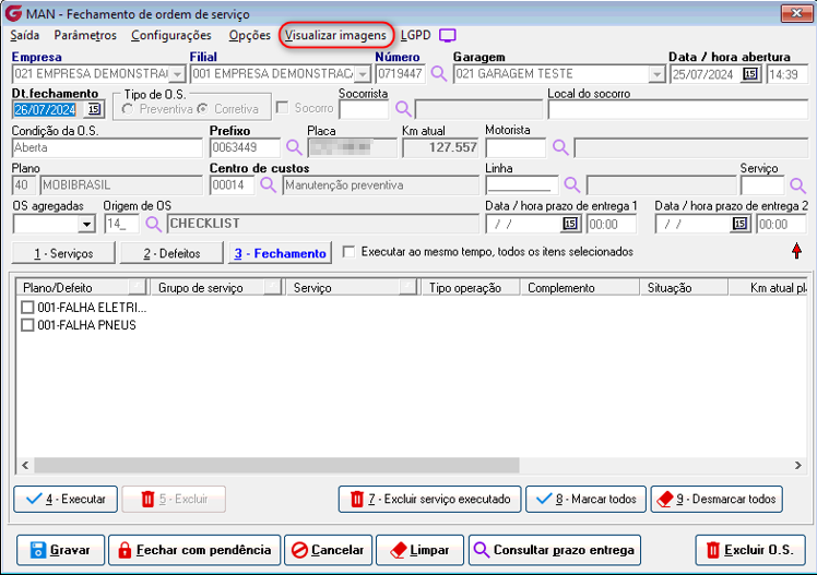 Empresa - Informe a empresa da movimentação Filial - Informe a filial da movimentação Número - Informe o número da O.S. ou clique no botão de pesquisa e selecione Garagem - Campo é preenchido pelo sistema de acordo com a O.S. selecionada Data/hora da abertura - Campo é preenchido de acordo com a data e hora da abertura da O.S. Dt. fechamento - Informe a data de fechamento Tipo de O.S. - Identificação do tipo de O.S. preventiva ou corretiva Socorro - Campo para identificação de O.S. aberta como socorro Socorrista - Identificação do socorrista informado na abertura da O.S. Local do socorro - Identificação do local do socorro informado na O.S. Condição da O.S. - Identificação da condição da O.S. aberta, fechada, fechada parcialmente ou fechada por outra O.S. Prefixo - Identificação do prefixo do veículo Placa - Identificação da placa do veículo Km atual do veículo - Identificação do km atual do veículo Motorista - Identificação do motorista informado na abertura Plano - Código e descrição do plano de contas Centro de custos - Código e descrição do centro de custos Linha - Identificação da linha informada a abertura da O.S. OS agregradas - Identificação das OS que foram agregadas Origem de OS - Código e descrição da origem de O.S. Data/hora prazo de entrega 1 - Prazo de entrega informado na abertura da O.S. Data/hora prazo de entrega 2 - Prazo de entrega informado na abertura da O.S. Botão Serviços - Clique no botão para visualizar os serviços da O.S. ou incluir novos serviços