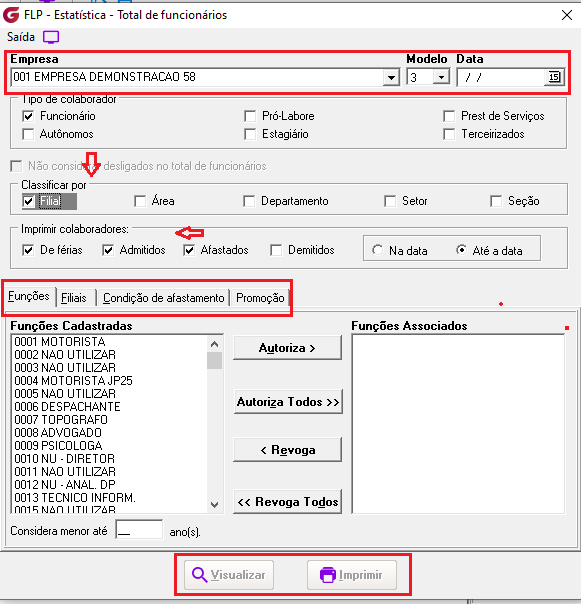 Será exibida a tela abaixo, onde é necessário informar os campos EMPRESA, MODELO, DATA e aplicar o filtro conforme o TIPO DE COLABORADOR desejado. Além disso, é possível incluir filtros adicionais, como FUNÇÕES, FILIAIS, CONDIÇÃO DE AFASTAMENTO e PROMOÇÃO, para refinar ainda mais os resultados.