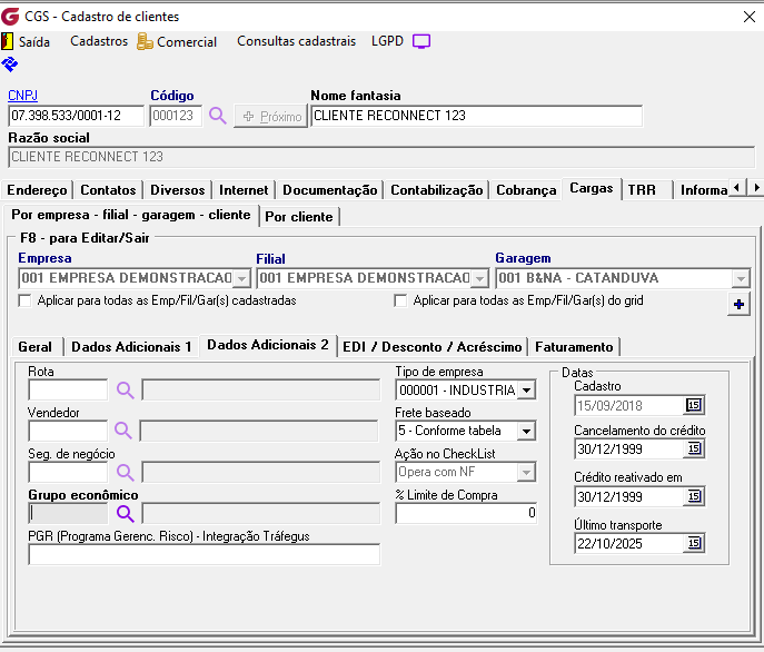 Cadastros > Dados de clientes > Clientes correntistas > Aba Cargas > Aba Dados adicionais 2 > Campo " Grupo Econômico"