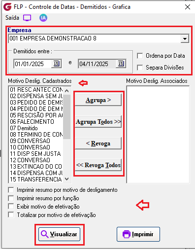 Selecione o Motivo do Desligamento Cadastro e clique em "Agrupa".