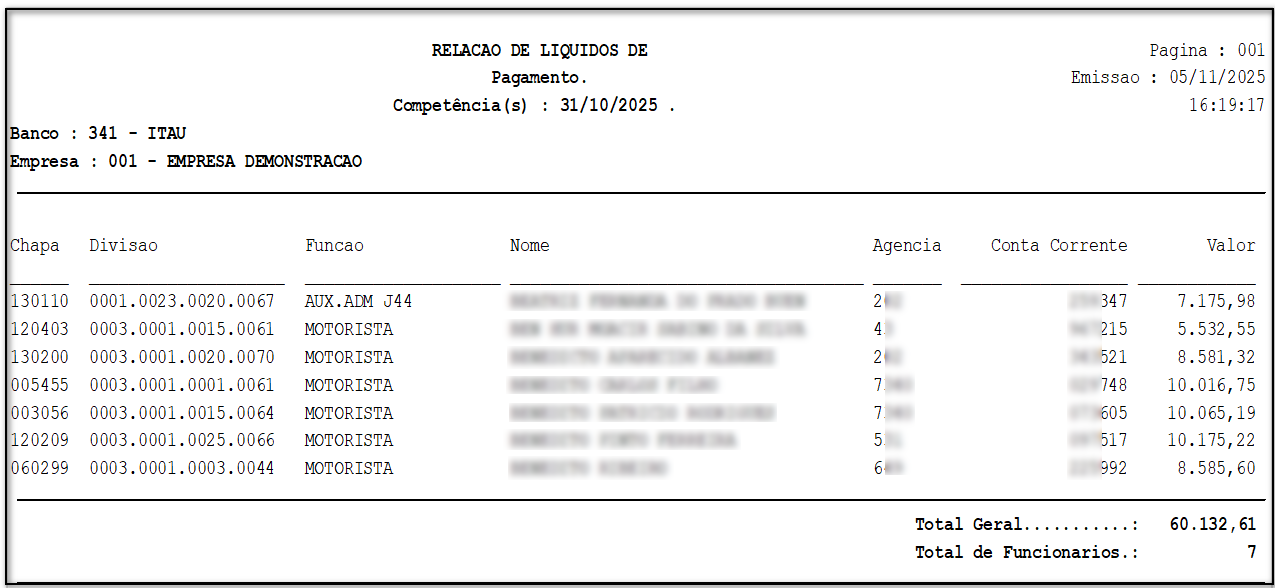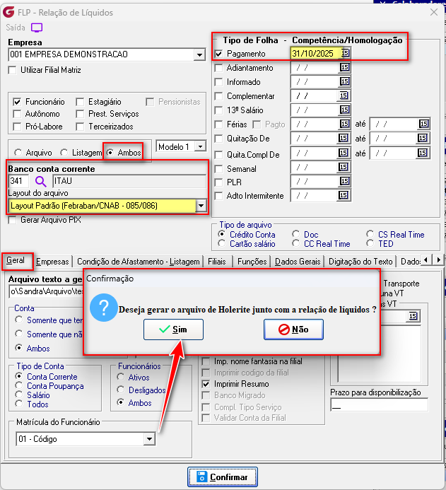 Passo a Passo para Geração do Arquivo – Layout Padrão FEBRABAN CNAB 085/086 Aba: Dados Gerais: Para gerar o arquivo, siga o caminho no sistema: Menu: FLP > Relatórios > Relatórios Mensais > Relação de Líquido Configurações: Empresa: Selecione a empresa desejada. Tipo de Folha: Exemplo: Pagamento. Tipo de Vínculo: Funcionários, Sócios ou Autônomos. Arquivo: Selecione Ambos (para gerar o arquivo e a listagem). Banco Conta Corrente: Itaú. Layout do Arquivo: Layout Padrão (FEBRABAN / CNAB 085/086). Tipo de Arquivo: Crédito em Conta. Arquivo Texto a Gerar: Informe o nome desejado e o diretório onde o arquivo será salvo. Observação: Avalie as demais opções de filtro disponíveis na tela conforme necessidade. Deseja gerar o arquivo Holerite junto com a relação de líquidos? Ao selecionar Sim, o sistema irá gerar o arquivo contendo: Os dados bancários dos colaboradores e as informações do Holerite correspondentes no mesmo arquivo.