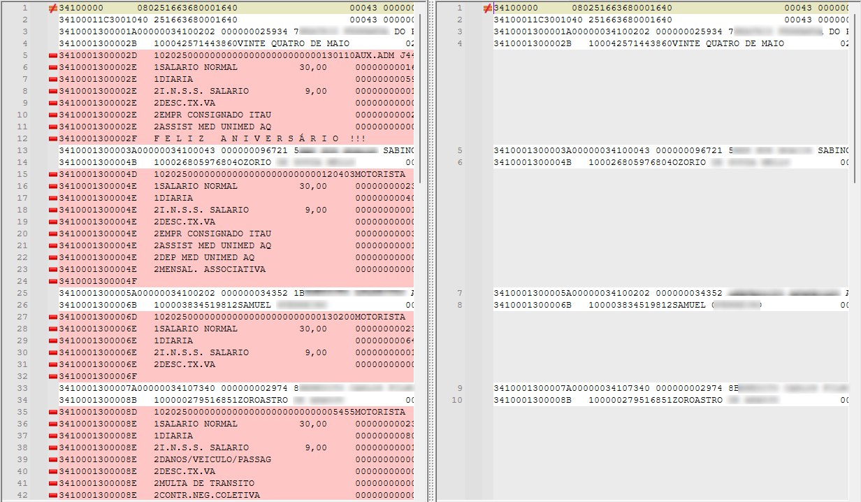 Emissão de Arquivo de Holerite conforme Layout Padrão FEBRABAN / CNAB 085/086). Geração do arquivo de Holerite seguindo o layout especificado, contendo todos os valores bancários integrados às informações do Holerite. Comparativo do Layout CNAB 085/086 – Versão Anterior x Atual Ao comparar o layout anterior com a geração atual do arquivo CNAB 085/086, observe que foi adicionado um bloco em vermelho contendo as informações do Holerite.