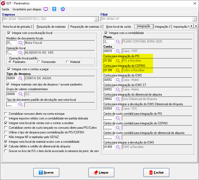 Definição de contas para integração de PIS e COFINS à contabilidade de lançamentos de material avulso e serviço. |