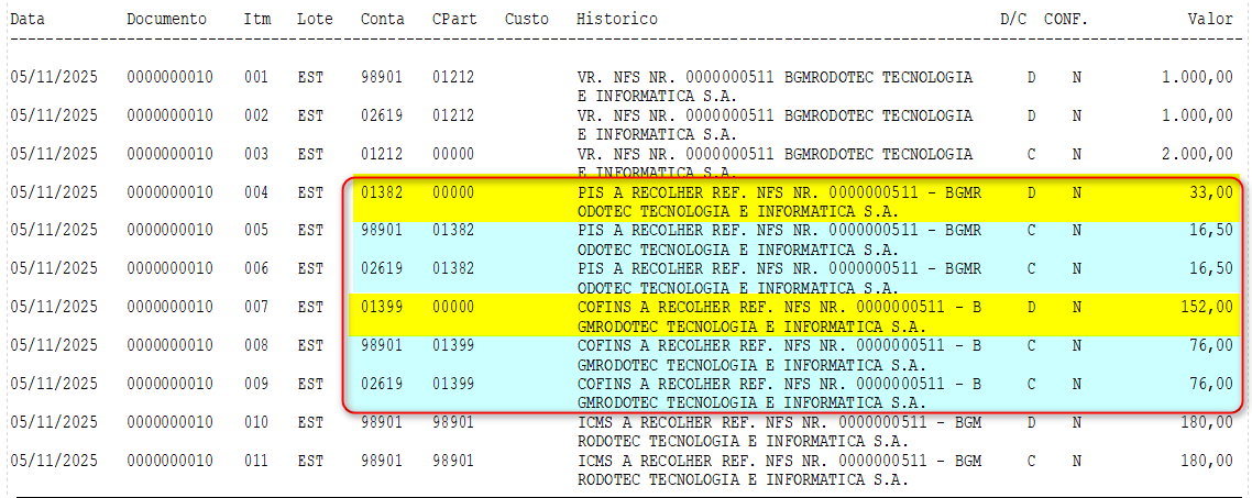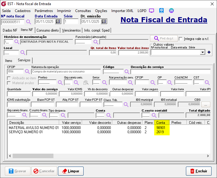 Parâmetros>Estoque>Integração Os valores de PIS e COFINS de materiais avulsos e serviços são integrados como conta débito nas respectivas contas informadas no parâmetro do estoque. ![]() Diários> Entradas> Por nota fiscal Os valores de PIS e COFINS de materiais avulsos e serviços são integrados como conta crédito nas contas informadas no lançamento da nota fiscal.