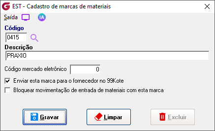 Cadastros> Marcas Código - O código é sugerido sequencialmenteDescrição - Campo para registro da descrição da marca Enviar esta marca para o fornecedor no 99Kote - Marque esta opção para que a marca seja incluída ao fornecedor nas cotações enviadas ao NSKote. Bloquear movimentação de entrada de materiais com esta marca - Com esta opção marcada, a marca fica bloqueada em movimentações de entrada. ![]() Para associar uma marca ao material, acesse o cadastro de materiais, selecione a marca no campo "Marcas disponíveis" e clique no botão "Autoriza". ![]() Se algum auxílio ou esclarecimento for necessário, conte conosco através de nossos canais de atendimento. Telefone: (11) 5018-2525. Portal do Cliente: https://portaldocliente.praxio.com.br/ #PodeContar