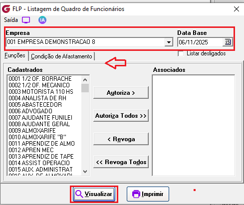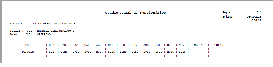 ![]() O sistema gerará o relatório contendo o quadro do funcionário, conforme a data-base informada. Nota: No exemplo abaixo, o período exibido foi definido com base na data-base previamente inserida.