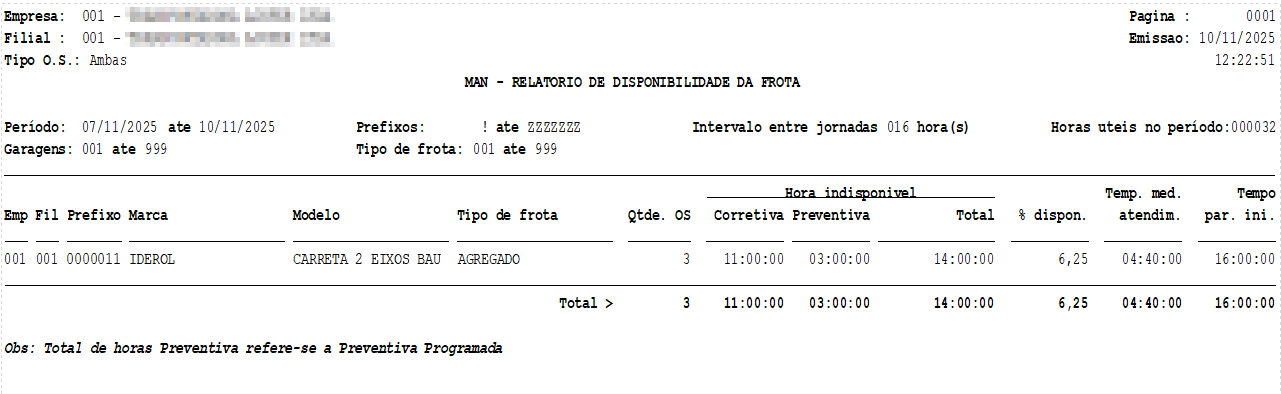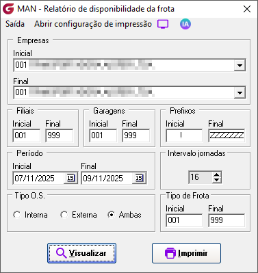 Empresas | Inicial / Final - Informe as empresas para consulta Filiais | Inicial / Final - Informe as filiais para consulta Garagens | Inicial / Final - Informe as garagens para consulta Prefixos | Inicial / Final - Informe os prefixos para consulta Período | Inicial / Final - Informe o período das datas de abertura das ordens de serviço Intervalo jornadas - Define a quantidade de horas úteis no período, por exemplo, se a jornada diária for de 08 horas, informe um intervalo de 16 horas. Tipo de O.S. | Interna / Externa / Ambas - Filtre pelo tipo de O.S. para consulta Tipo de frota | Inicial / Final - Informe os tipos de frota para consulta Botão Visualizar - Após informar os filtros clique para visualizar o relatório Botão Imprimir - Após informar os filtros clique para imprmir o relatório Exemplo de impressão do relatório % disponibilidade = 100 - ((14+16) / 32) x 100) = 6,25 %