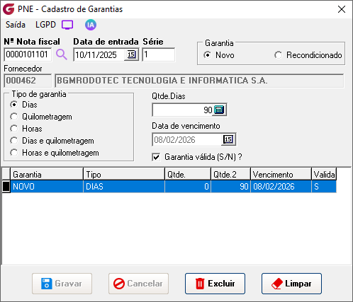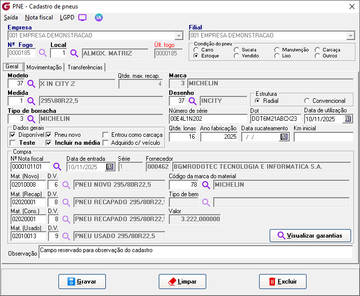 Geral Modelo - Informe ou selecione o código do modelo do pneu Qtde. max. recap. - Número máximo de recapagens cadastrado no modelo Marca - Informe ou selecione a marca do pneu Medida - Informe ou selecione a medida do pneu Desenho - Informe ou selecione o desenho do pneu Estrutura | Radial / Convencional - Selecione o tipo de estrutura Tipo de borracha - Campo para informar ou selecionar o tipo de borracha Número de série - Campo para informar o número de série do pneu Dot - Campo para informar o Dot do pneu Data de utilização - Informe a data de início de utilização do pneu Dados gerais: Disponível - Marque essa opção para disponibilizar o pneu para movimentação Pneu novo - Marque essa opção para identificar o pneu adquirido como novo Entrou como carcaça - Marque essa opção para identificar pneu que foi adquirido como carcaça ou pneu já recapado Teste - Marque essa opção para identificar pneu adquirido como teste Incluir na médida - Marque essa opção para incluir os dados de movimentação desse pneu na média geral, desmarcado o valores não serão considerados nos relatórios de desempenho Adquirido com o veículo - Marque essa opção para identificar pneus que foram adquiridos junto à compra de veículo Compra: Nº nota fiscal - Campo para selecionar a nota fiscal de compra do pneu, obrigatoriedade do campo é definida pelo parâmetro "Informar nota fiscal no cadastro de pneus". Data de entrada | Série | Fornecedor - Informações contidas na nota fiscal selecionada no campo nº nota fiscal Mat. (Novo) - Informe o código do item de estoque que deve ser associado ao pneu enquanto estiver como novo Mat. (Recap) - Informe o código do item de estoque que deve ser associado ao pneu enquanto estiver como recapado Mat. (Cons) - Informe o código do item de estoque que deve ser associado ao pneu enquanto estiver como consertado Mat. (Usado) - Informe o código do item de estoque que deve ser associado ao pneu enquanto estiver como usado Código da marca do material - Informe o código da marca dos materiais associados ao pneu, todos devem ter a mesma marca Tipo de bem - Campo para informar o código do tipo de bem quando não houver integração com o módulo de estoque Valor - Campo com o valor informado na nota fiscal de compra, quando não houver nota fiscal associada, o valor deve ser informado manualmente. Observação - Campo para informar observações pertinentes ao cadastro do pneu Visualizar Garantias - Botão para visualizar a garantia informada no momento do cadastro do pneu