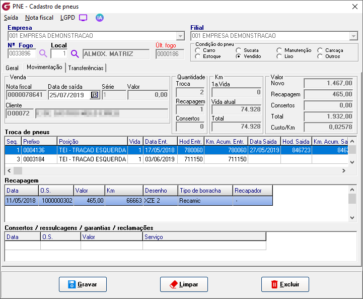 Quantidade - Campos com as quantidades de trocas, recapagens e consertos Km - Campos com dados das quilometragens de 1ª vida, vida atual e total Valor - Campos com valores enquanto novo, recapado, consertado e total além de Custo/km Troca de pneus - Campos com dados das movimentações Recapagem - Campo com dados das recapagens Consertos / ressulcagens / garantias / reclamações - Campo com dados das movimentações Transferências Históricos das transferência realizadas Se algum auxílio ou esclarecimento for necessário, conte conosco através de nossos canais de atendimento. Telefone: (11) 5018-2525. Portal do Cliente: https://portaldocliente.praxio.com.br/ #PodeContar