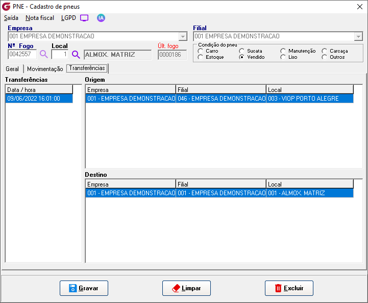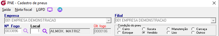 Cadastros> Pneus Menu Nota fiscal - Utilize o menu para selecionar a nota fiscal da compra do pneu. Empresa - Informe a empresa Filial - Informe a filial Nº Fogo - Informe o número de fogo Local - Informe ou selecione o local de cadastro Ult. fogo - Número de fogo do último cadastro Condição do pneu - Condição atualizada de acordo com a movimentação