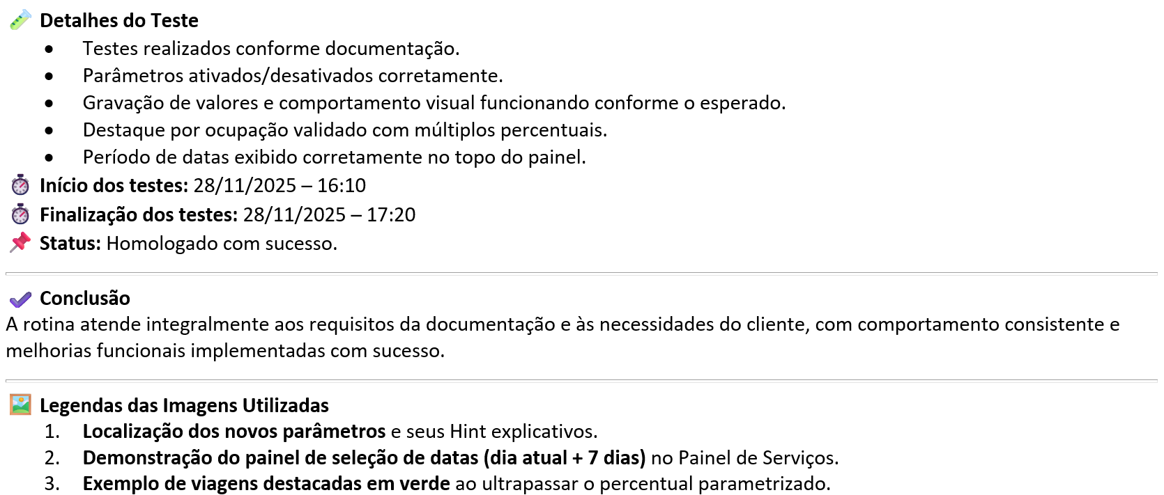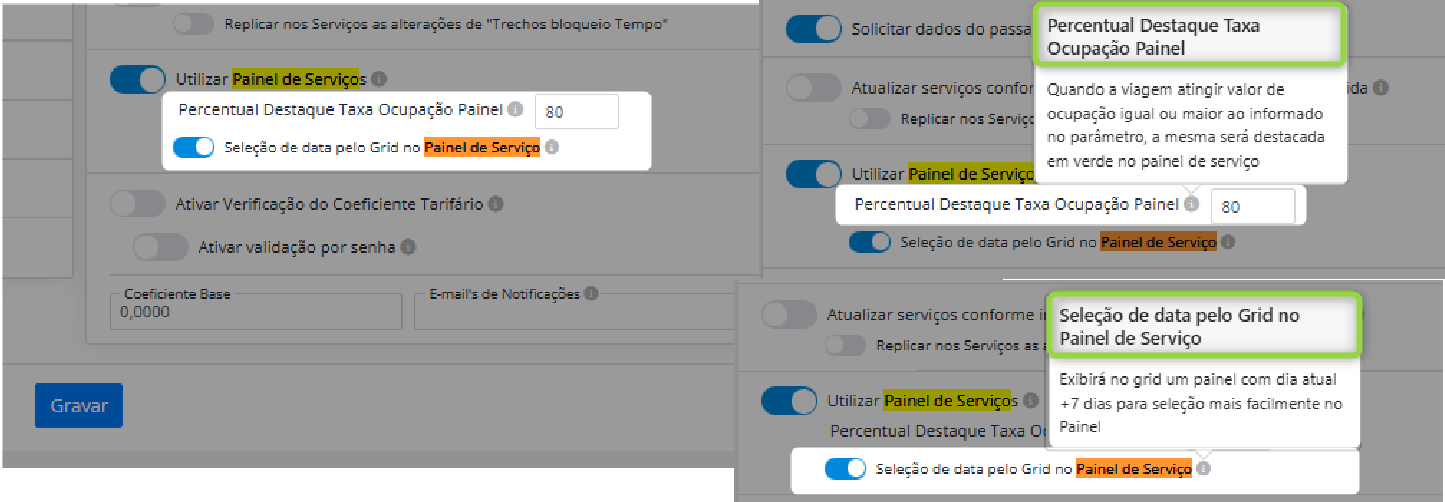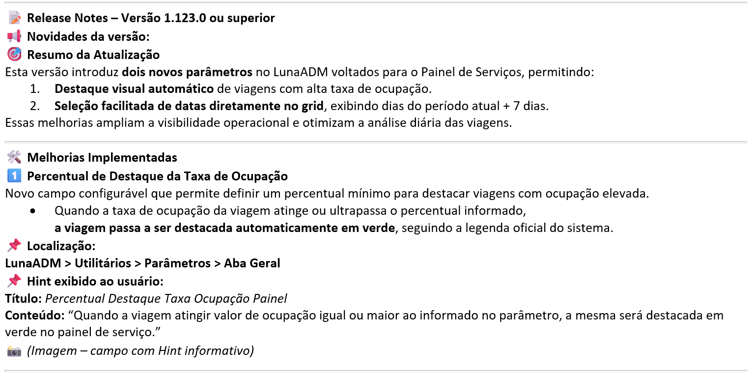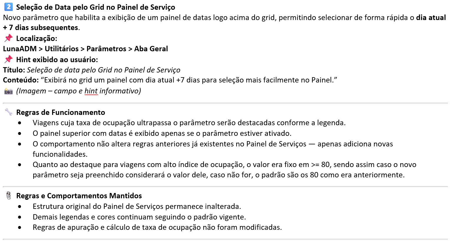 Caminho de acesso: Luna ADM [Caminho]: Utilitários > Parâmetros > Aba Geral > Percentual Destaque Taxa Ocupação Painel Utilitários > Parâmetros > Aba Geral >Seleção de data pelo Grid no Painel de Serviço |