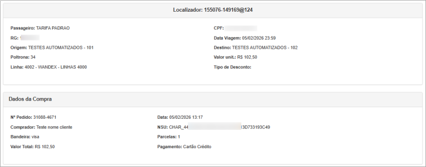 Figura 02 - Imagem ilustrativa da tela de confirmação de compra exibida no site após a confirmação do pagamento. Com o novo parâmetro “Habilitar impressão posterior na venda (voucher)” habilitado, o QR Code para embarque não é apresentado.