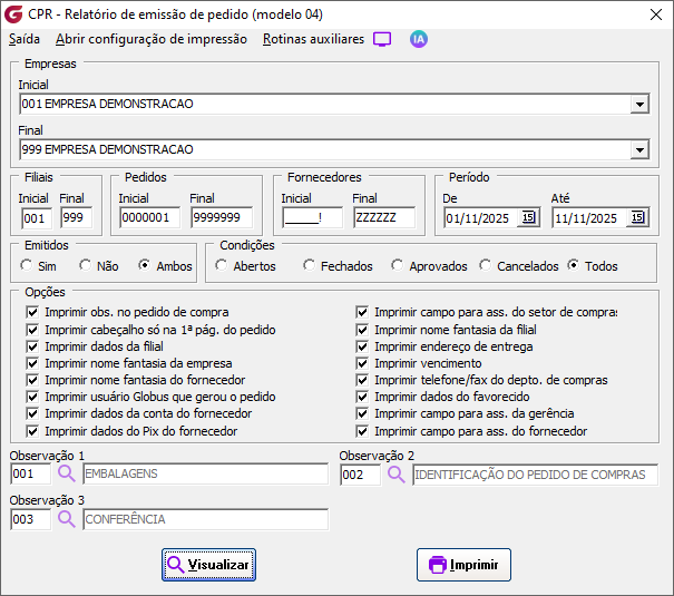 Empresas | Inicial / Final - Define o intervalo de empresas Filiais | Inicial / Final - Define o intervalo de filiais Pedidos | Inicial - Final - Define o intervalo de pedidos Fornecedores | Inicial / Final - Define o intervalo de fornecedores Período | De / Até - Define o intervalo de datas Emitidos | Sim / Não / Ambos - Quando selecionada a opção "Não", são impressos apenas os pedidos ainda não impressos Condições | Abertos / Fechados / Aprovados / Cancelados / Todos - São impressos os pedidos de acordo com a condição selecionada. Rotinas auxiliares | Cadastro de observações - Tela para cadastrar observações a serem utilizadas no relatório.