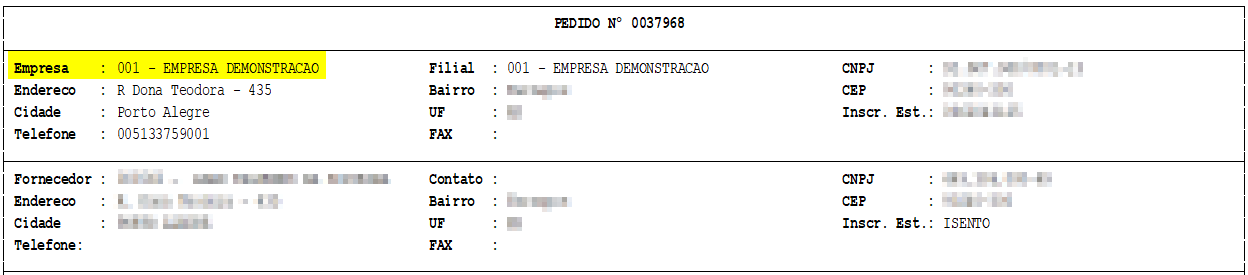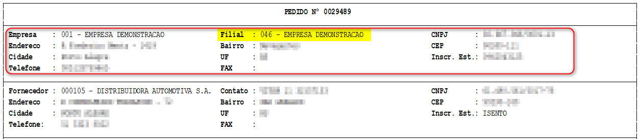 Imprimir cabeçalho só na 1ª página do pedido - Com a opção marcada o cabeçalho só é impresso na primeira página do pedido. Imprimir dados da filial - Com a opção marcada são apresentados os dados da empresa e filial do pedido, desmarcada, são apresentados os dados da empresa/filial matriz.