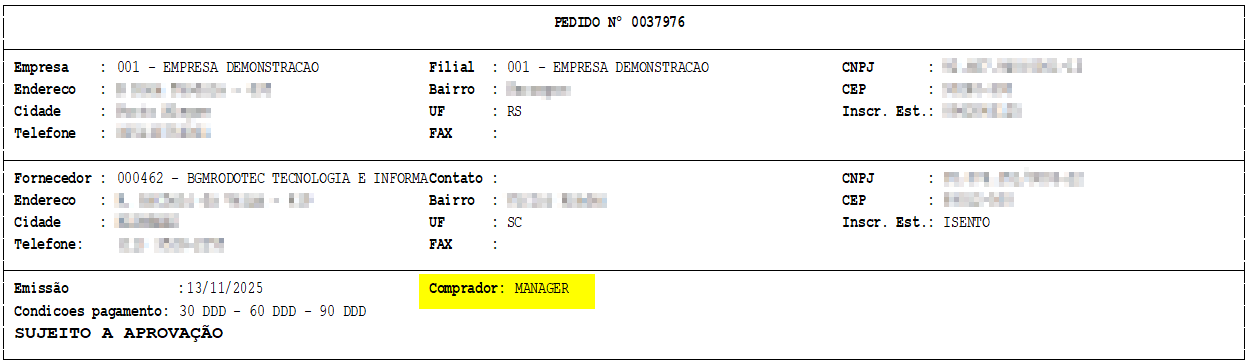 Imprimir campo para ass. do setor de compras - Com a opção marcada é impresso campo para assinatura do setor de compras.