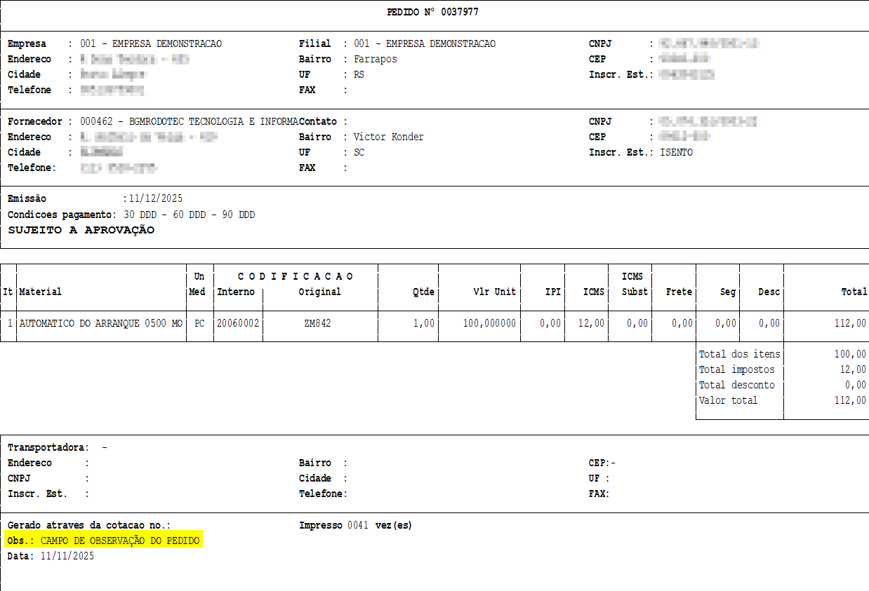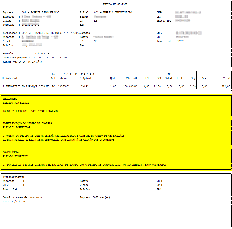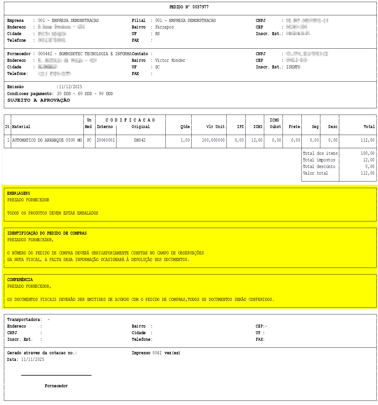 Impressão com informações de pedido de compras de itens de estoque e materiais avulsos/serviços. |